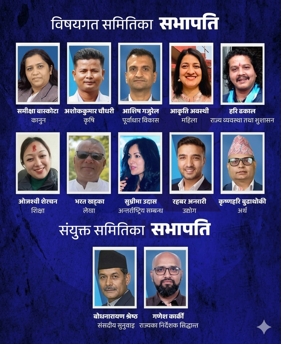 राज्यका निर्देशक सिद्धान्त, नीति र दायित्वको कार्यान्वयन अनुगमन तथा मूल्यांकन सभापतिमा गणेश कार्की, शिक्षा, स्वास्थ्य तथा सूचना प्रविधि समिति सभापतिमा ओजस्वी शेरचन र उद्योग वाणिज्य र श्रम तथा उपभोक्ता हित समिति सभापतिमा रहबर अन्सारी छन् ।