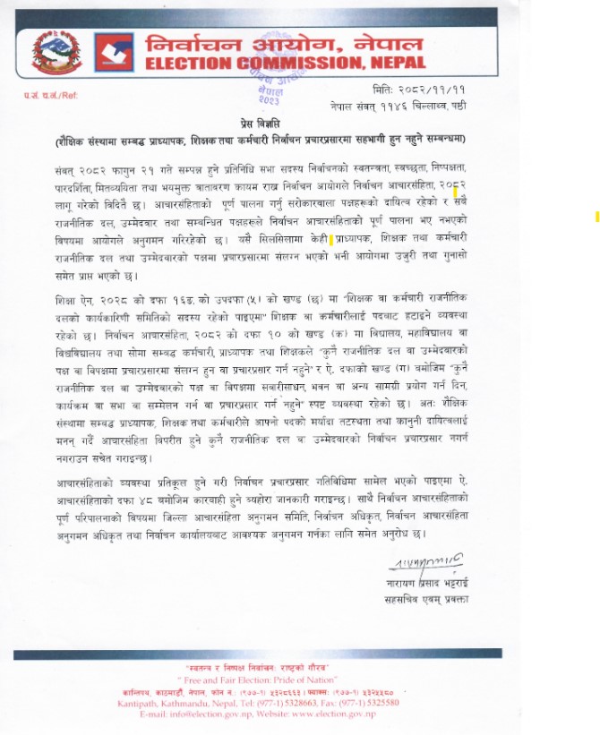 निर्वाचन आयोगले शिक्षक, प्राध्यापक र कर्मचारीहरूलाई निर्वाचन आचारसंहिता विपरीत कुनै पनि दल र उम्मेदवारको चुनाव प्रचारमा नलाग्न चेतावनी दिएको छ ।