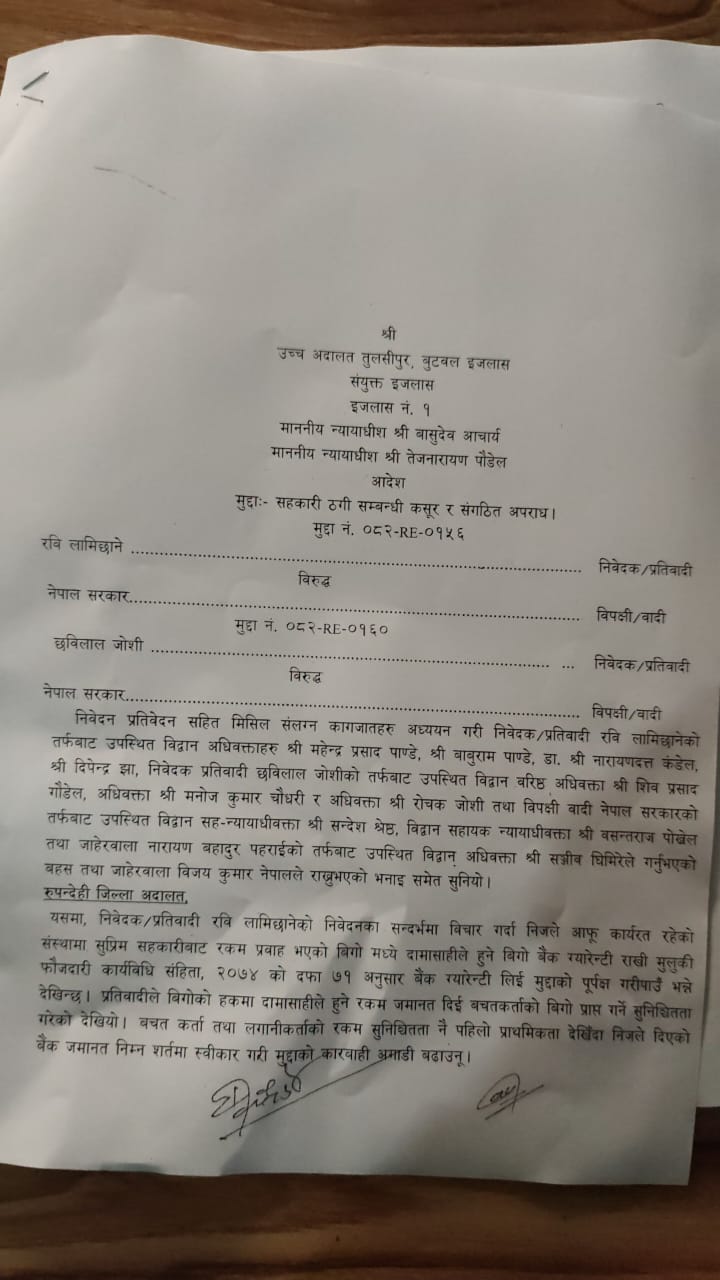 न्यायाधीश बासुदेव आचार्य र तेजनारायण पौडेलको इजलासमा उनीहरूको मुद्दाको सुनुवाइ भएको हो । लामिछानेले बिगो बापतको रकम बुझाएर थुनाबाहिर बस्नु पाउँ भनी निवेदन दिएका थिए ।